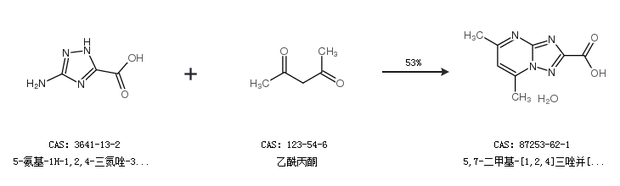 2.通过5-氨基-1H-1,2,4-三氮唑-3-羧酸和乙酰丙酮合成5,7-二甲基-[1,2,4]三唑并[1,5-a]嘧啶-2-羧酸,收率约53%;