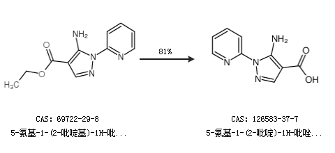 1.通过5-氨基-1-(2-吡啶基)-1H-吡唑-4-羧酸乙酯合成5-氨基-1-(2-吡啶)-1H-吡唑-4-羧酸,收率约81%;