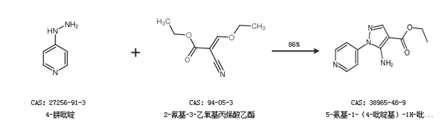 1.通过4-肼吡啶和2-氰基-3-乙氧基丙烯酸乙酯合成5-氨基-1-(4-吡啶基)-1H-吡唑-4-羧酸乙酯,收率约86%;