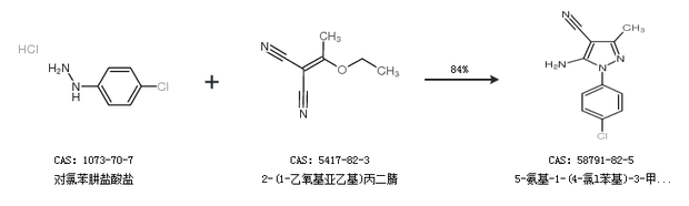 1.通过对氯苯肼盐酸盐和2-(1-乙氧基亚乙基)丙二腈合成5-氨基-1-(4-氯l苯基)-3-甲基-1H-吡唑-4-甲腈,收率约84%;