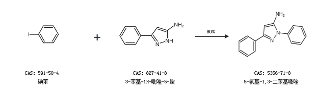 2.通过碘苯和3-苯基-1H-吡唑-5-胺合成5-氨基-1,3-二苯基哌唑,收率约90%;