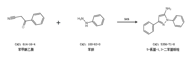 1.通过苯甲酰乙腈和苯肼合成5-氨基-1,3-二苯基哌唑,收率约94%;