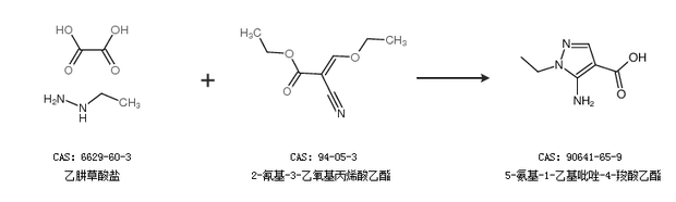 1.通过乙肼草酸盐和2-氰基-3-乙氧基丙烯酸乙酯合成5-氨基-1-乙基吡唑-4-羧酸乙酯
