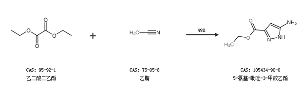 2.通过乙二酸二乙酯和乙腈合成5-氨基-吡唑-3-甲酸乙酯,收率约49%;