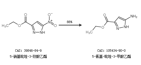 1.通过5-硝基吡唑-3-羧酸乙酯合成5-氨基-吡唑-3-甲酸乙酯,收率约88%;