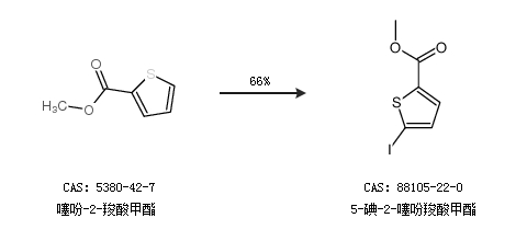 2.通过噻吩-2-羧酸甲酯合成5-碘-2-噻吩羧酸甲酯,收率约66%;
