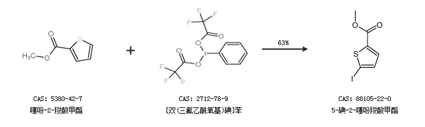 1.通过噻吩-2-羧酸甲酯和[双(三氟乙酰氧基)碘]苯合成5-碘-2-噻吩羧酸甲酯,收率约63%;