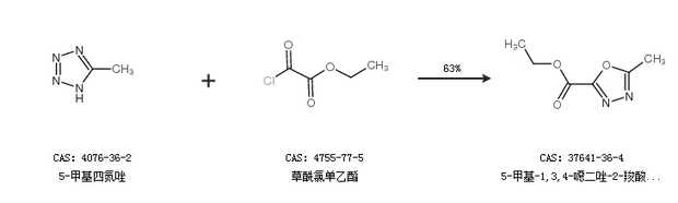 1.通过5-甲基四氮唑和草酰氯单乙酯合成5-甲基-1,3,4-噁二唑-2-羧酸乙酯,收率约63%;