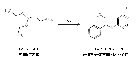 2.通过原甲酸三乙酯合成5-甲基-6-苯基噻吩[2,3-D]嘧啶-4-醇,收率约85%;