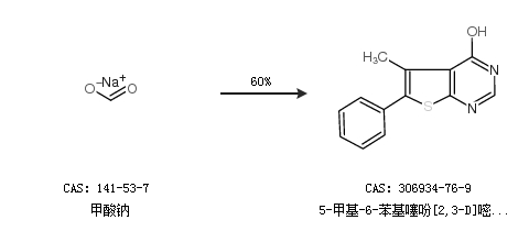 1.通过甲酸钠合成5-甲基-6-苯基噻吩[2,3-D]嘧啶-4-醇,收率约60%;
