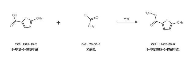 1.通过5-甲基-2-噻吩甲酸和乙酰氯合成5-甲基噻吩-2-羧酸甲酯,收率约78%;