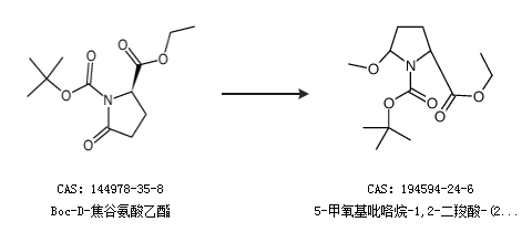 2.通过Boc-D-焦谷氨酸乙酯合成5-甲氧基吡咯烷-1,2-二羧酸-(2S)-1-叔丁基-2-乙酯