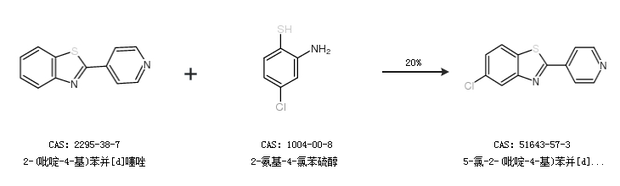 2.通过2-(吡啶-4-基)苯并[d]噻唑和2-氨基-4-氯苯硫醇合成5-氯-2-(吡啶-4-基)苯并[d]噻唑,收率约20%;