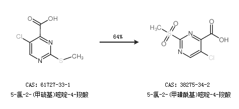 1.通过5-氯-2-(甲硫基)嘧啶-4-羧酸合成5-氯-2-(甲磺酰基)嘧啶-4-羧酸,收率约64%;