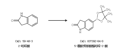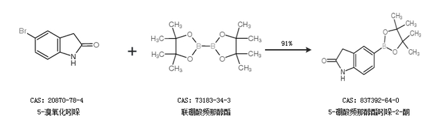 1.通过5-溴氧化吲哚和联硼酸频那醇酯合成5-硼酸频那醇酯吲哚-2-酮,收率约91%;