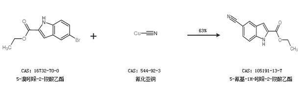 1.通过5-溴吲哚-2-羧酸乙酯和氰化亚铜合成5-氰基-1H-吲哚-2-羧酸乙酯,收率约63%;