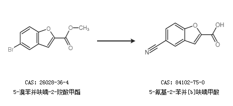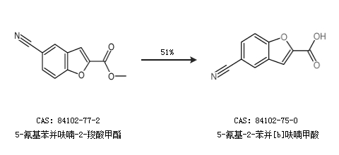 1.通过5-氰基苯并呋喃-2-羧酸甲酯合成5-氰基-2-苯并[b]呋喃甲酸,收率约51%;