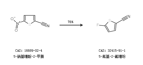1.通过5-硝基噻酚-2-甲腈合成5-氰基-2-氟噻吩,收率约76%;