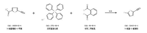 2.通过5-硝基噻酚-2-甲腈、四苯基溴化鏻和邻苯二甲酰氯合成5-氰基-2-氟噻吩,收率约61%;