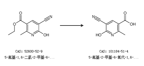 1.通过5-氰基-1,6-二氢-2-甲基-6-氧代-3-吡啶羧酸乙酯合成5-氰基-2-甲基-6-氧代-1,6-二氢-3-吡啶羧酸,收率约10%;