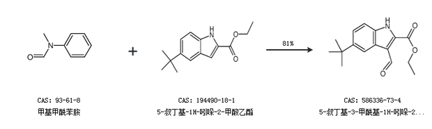 1.通过甲基甲酰苯胺和5-叔丁基-1H-吲哚-2-甲酸乙酯合成5-叔丁基-3-甲酰基-1H-吲哚-2-羧酸乙酯,收率约81%;