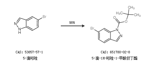 1.通过5-溴吲唑合成5-溴-1H-吲唑-1-甲酸叔丁酯,收率约98%;