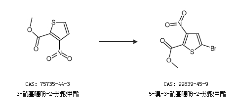 1.通过3-硝基噻吩-2-羧酸甲酯合成5-溴-3-硝基噻吩-2-羧酸甲酯