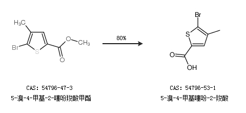 1.通过5-溴-4-甲基-2-噻吩羧酸甲酯合成5-溴-4-甲基噻吩-2-羧酸,收率约80%;