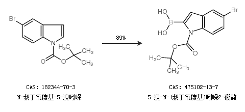 1.通过N-叔丁氧羰基-5-溴吲哚合成5-溴-N-(叔丁氧羰基)吲哚2-硼酸,收率约89%;