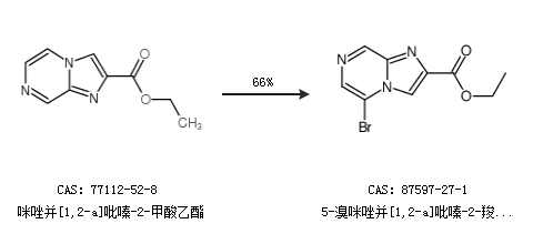 1.通过咪唑并[1,2-a]吡嗪-2-甲酸乙酯合成5-溴咪唑并[1,2-a]吡嗪-2-羧酸乙酯,收率约66%;