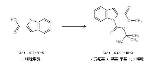 英文别名 1-tert-butyl 2-methyl 1H-indole-1,2-dicarboxylate;methyl 1-t-butoxycarbonylindole-2-carboxylate;1-tert-butoxycarbonyl-2-methoxycarbonylindole;methyl N-(tert-butoxycarbonyl)indole-2-carboxylate;1-tert-butyl 2-methyl indole-1,2-dicarboxylate;