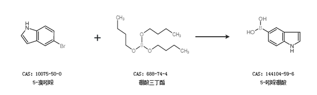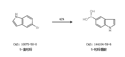 1.通过5-溴吲哚合成5-吲哚硼酸,收率约42%;