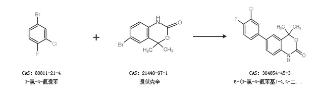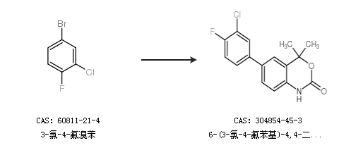 2.通过3-氯-4-氟溴苯和溴伏克辛合成6-(3-氯-4-氟苯基)-4,4-二甲基-1H-苯并[d][1,3]噁嗪-2(4h)-酮