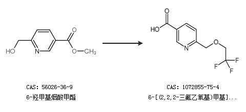 1.通过2,2,2-三氟乙醇合成6-[(2,2,2-三氟乙氧基)甲基]烟酸,收率约70%;