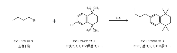 1.通过正溴丁烷和6-溴-1,1,4,4-四甲基-1,2,3,4-四氢化萘合成6-n-丁基-1,2,3,4-四氢-1,1,4,4-四甲基萘,收率约81%;