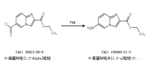1.通过6-硝基咪唑[1,2-Alpha]吡啶-2-羧酸乙酯合成6-氨基咪唑并[1,2-a]吡啶-2-甲酸乙酯,收率约79%;