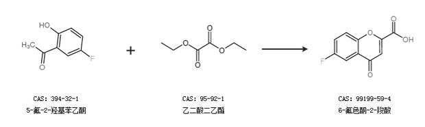1.通过5-氟-2-羟基苯乙酮和乙二酸二乙酯合成6-氟色酮-2-羧酸