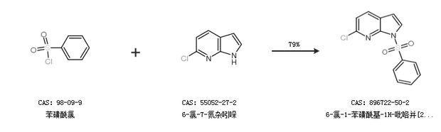 2.通过苯磺酰氯和6-氯-7-氮杂吲哚合成6-氯-1-苯磺酰基-1H-吡咯并[2,3-b]吡啶,收率约79%;