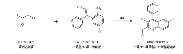 1.通过一氯代乙酰氯和2-氨基-5-氯二苯酮肟合成6-氯-2-(氯甲基)-4-苯基喹唑啉-3-氧化物,收率约76%;