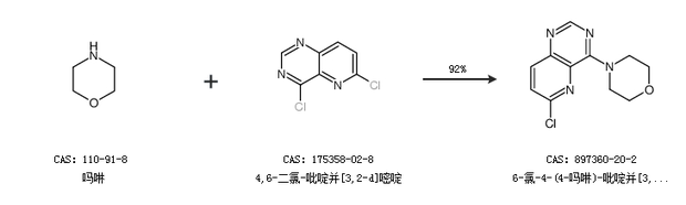 1.通过吗啉和4,6-二氯-吡啶并[3,2-d]嘧啶合成6-氯-4-(4-吗啉)-吡啶并[3,2-d]嘧啶,收率约92%;