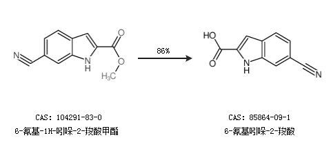 1.通过6-氰基-1H-吲哚-2-羧酸甲酯合成6-氰基吲哚-2-羧酸,收率约86%;