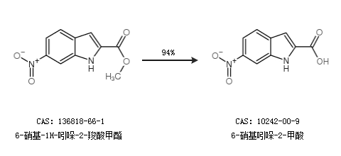 1.通过6-硝基-1H-吲哚-2-羧酸甲酯合成6-硝基吲哚-2-甲酸,收率约94%;