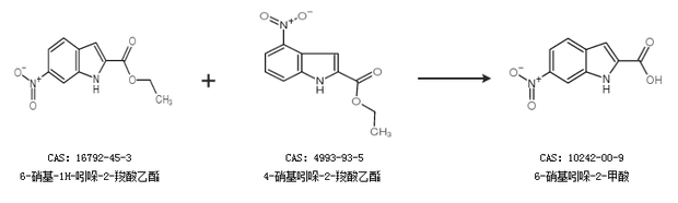 2.通过6-硝基-1H-吲哚-2-羧酸乙酯和4-硝基吲哚-2-羧酸乙酯合成6-硝基吲哚-2-甲酸