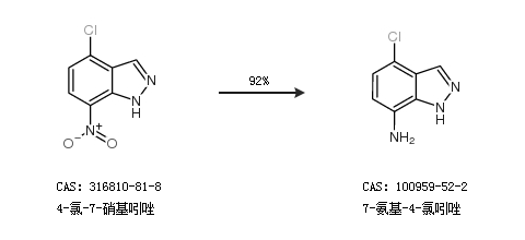 1.通过4-氯-7-硝基吲唑合成7-氨基-4-氯吲唑,收率约92%;