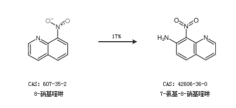 1.通过8-硝基喹啉合成7-氨基-8-硝基喹啉,收率约17%;