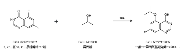 1.通过5,7-二氟-3,4-二氢喹唑啉-4-酮和异丙醇合成7-氟-5-异丙氧基喹唑啉-4(3H)-酮,收率约70%;