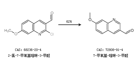 1.通过2-氯-7-甲氧基喹啉-3-甲醛合成7-甲氧基-喹啉-3-甲醛,收率约62%;