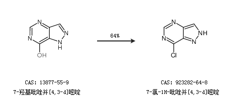 2.通过7-羟基吡唑并[4,3-d]嘧啶合成7-氯-1H-吡唑并[4,3-d]嘧啶,收率约64%;