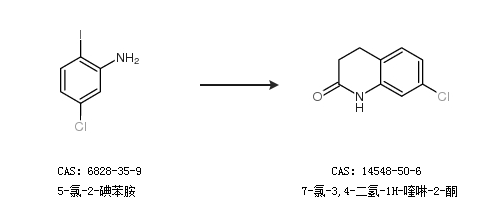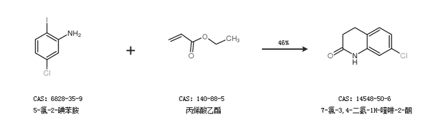 1.通过5-氯-2-碘苯胺和丙烯酸乙酯合成7-氯-3,4-二氢-1H-喹啉-2-酮,收率约46%;
