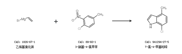 1.通过乙烯基溴化镁和3-硝基-4-氯甲苯合成7-氯-4-甲基吲哚